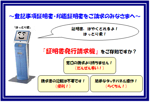 最近、法務局に置いてある証明書発行請求機”はっとり君”をご存知ですか?